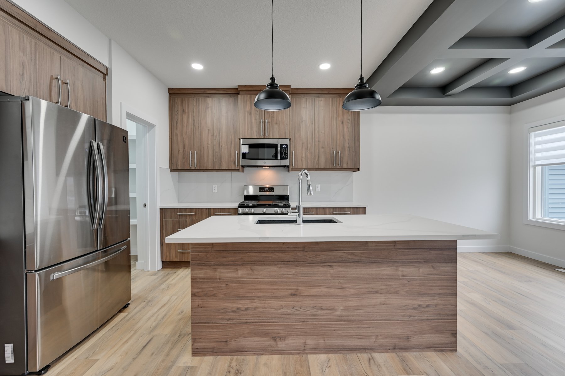 The Kitchen includes stainless steel appliances, quartz countertops, to-the-ceiling soft-closing cabinetry, a large island, and a walk-through pantry with MDF shelving.