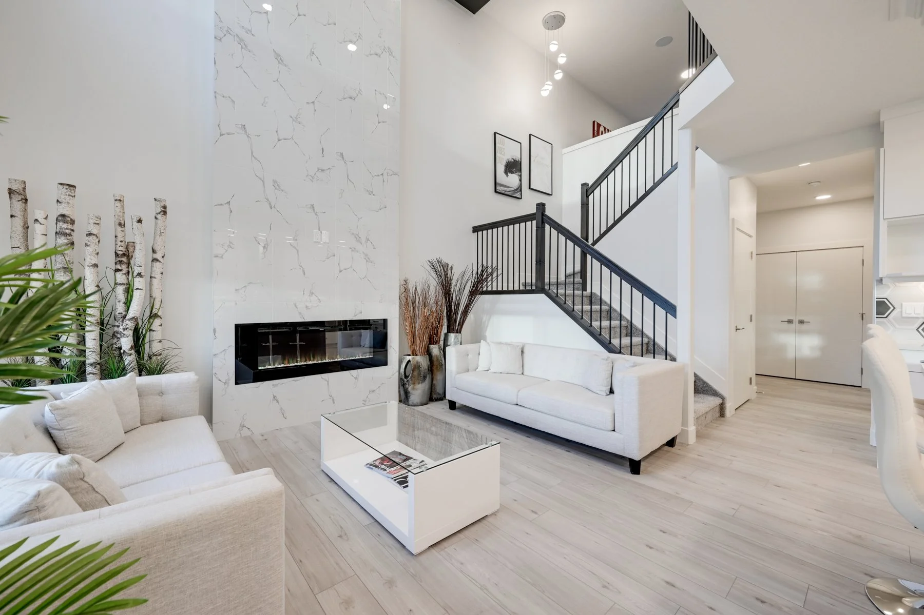 The Great Room features 18-foot ceilings and a 60-inch electric fireplace with stunning triple-pane windows.